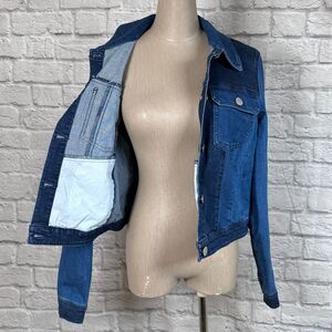 Long sleeve blue jean jacket with patchwork design. Two breast pockets on front of jacket with two pockets on the inside of jacket.