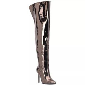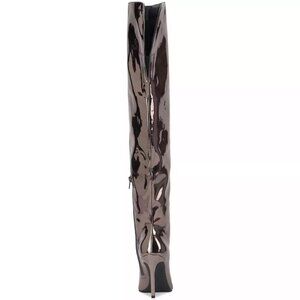 Elevate your style with these stunning INC International Concepts Women's Sedona metallic pewter thigh-high boots. These boots feature a pointed toe and zip closure for ease of wear. The shiny metallic pewter and zipper accents add a touch of glamour to any outfit. Perfect for any occasion, these boots are versatile enough to be worn to a wedding, party, formal event, or even for business. The flexible sole provides added comfort while the slip-resistant sole ensures traction. Minor scuffs.