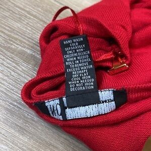 Gold bar accents on shoulders. Open shoulders style with 3/4 sleeves long. Red color perfect for Christmas. Size S. 100% Rayon.
