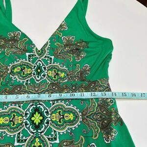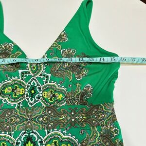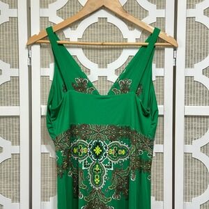 Striking maxi dress featuring a vibrant kelly green. This dress showcases a flattering babydoll V-neckline and a sleeveless design, perfect for warm weather. The bodice is adorned with an intricate paisley pattern and subtle rhinestones.