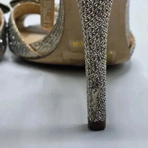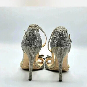 Some signs of wear as shown. Open-toe silver bedazzled pumps with bow and ankle straps.