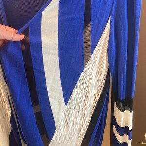 INC International Concepts blue white black open sweater 0X light weight material with Hankerchief hem in front. Graphic blue white black design. Black is sheee. Excellent condition