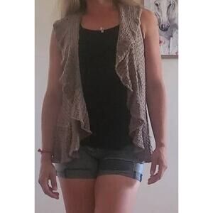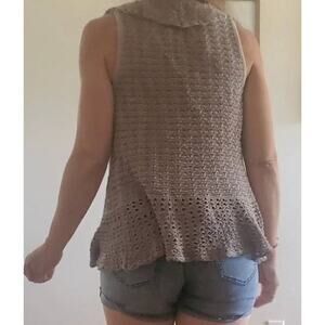 Thick knit vest. Ruffle collar and hem accent. Sleeveless.
