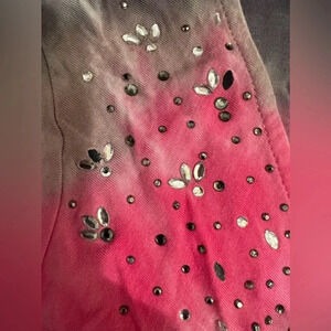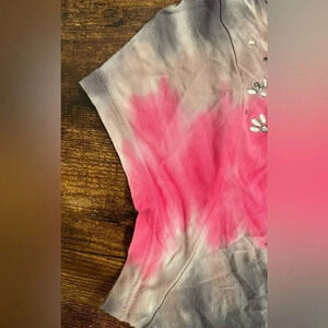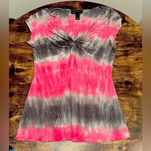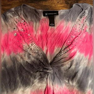 Womens tye dye front knotted shirt. Bejeweled front with rhinestones. V-neck. Cap sleeves. Stretchy, soft fabric. Lightweight. Beautiful colors. Good user condition.