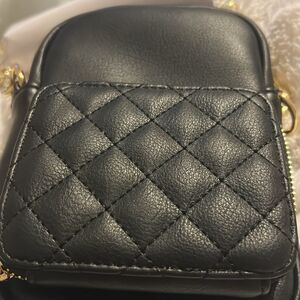 Elegant black quilted leather crossbody bag with gold chain accents. Perfect for any occasion.