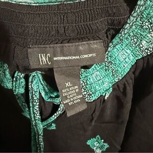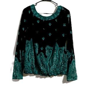 Elegant black blouse with teal paisley patterns. Long sleeves. Scoop neckline with tie detail.