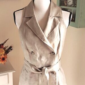 Beautiful linen dress. Tan with a little sheen. Cut in shoulders. Notched collar. 8 buttons. Tie at waist. Fully lined. Size 2 ( showing on my size 4-5 mannequin) measures 34 at chest, 28 at waist, 36 at hips. 38 long from shoulder to hem. Stock photos for style ideas only. This is a classic, perfect for work.
