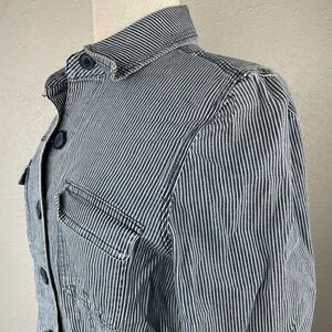 Super cute blue and white striped outfit by INC featuring a button down jacket and matching cropped pants. The jacket measures 20 inches armpit to armpit laying flat and 25 inches in length from shoulder to hem. The pants measure 16 inches at the waist and has a 26 inch inseam.