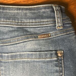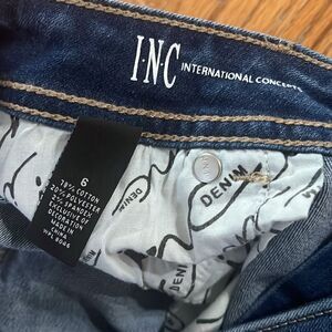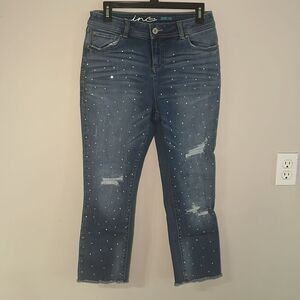 These blue skinny jeans from INC International Concepts feature a classic medium-wash with stylish distressed detailing and studded jewels on front.