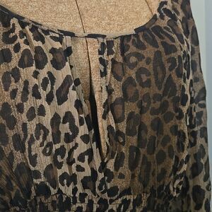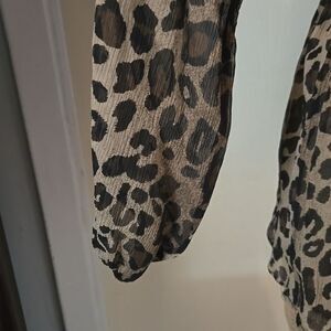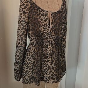Elevate your wardrobe with this elegant blouse from INC International Concepts, featuring long bell sleeves and a ruffled peplum design. The rich brown and tan hues create a sophisticated look, perfect for both casual and formal occasions. Crafted with a flowy silhouette, this top offers a blend of comfort and style.new no tags Leopard Print Puff Sleeve