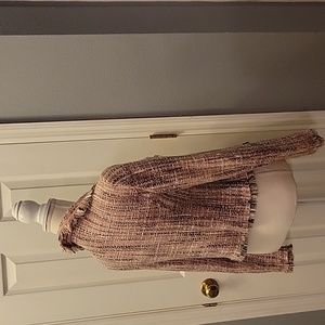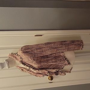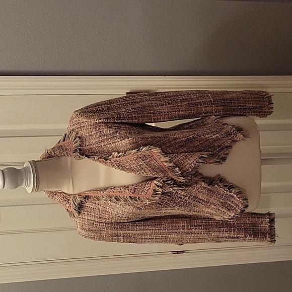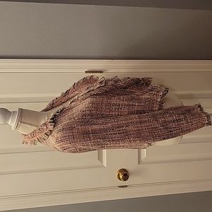 Fring edged with waterfall front folds, this INC jacket is fun and stylish. Pink, black and white are always popular colors. Please let me know if you have any questions!