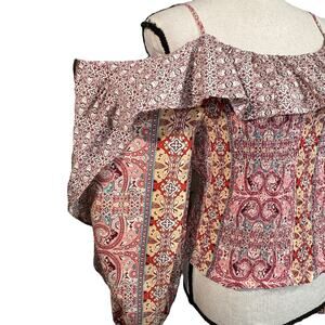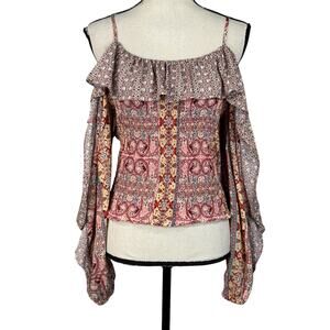 INC Large Cropped Top Geometric Smocked Off-Shoulder Ruffled Balloon Sleeves