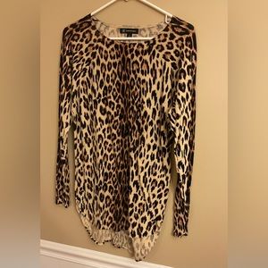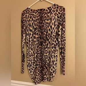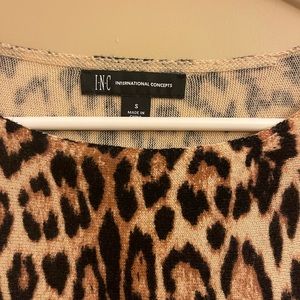This is an INC long sleeve shirt. Leopard print. Great condition. Size Small. Pit to Pit measures approx 20 inches. The front length measures 28 inches from shoulder to hem. The back length is approx 31 inches. The back is slightly longer.