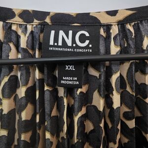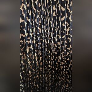 Stylish leopard print top. Features a black and tan pattern. Triple gold colored button cuff, v-neck, pleated shirt. Perfect for casual or dressy occasions, loose fitting and flowy.