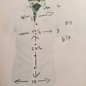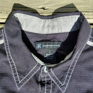 INC (Macy's) Mens Short Sleeve Button Up Shirt with contrast stitching and details. Pre gently worn. Cotton. Size Small. Please compare to what you currently wear so we can avoid a purchase - return - dance. I have included a visual schematic reference guide but refer to these measurements. Neck 15 " / Collar length 2 1/2" / Across Chest sleeve to sleeve 17" / Across Armpits 19 1/2" / Across Hem 19" / Top to bottom buttons 26 1/2" / Shoulder from collar to top of sleeve seam 6" / Sleeves - Inside 3" Outside 8 1/4" Opening 6 1/2". Any questions contact me prior to purchase.