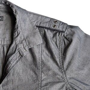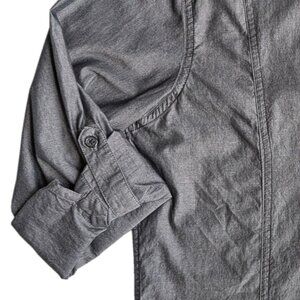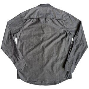 INC International Concepts men's long sleeve casual button up shirt. Dark gray with black accent piping across back seam and on shoulders. Matching gray buttons up the front and at the cuffs. Sleeves are cuffed and have roll-tab. Shoulders have grommet details. 100% cotton. Size small.
