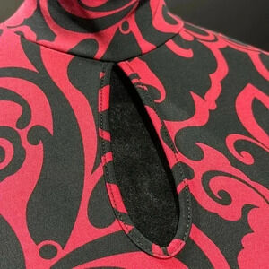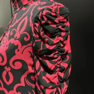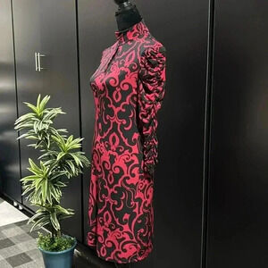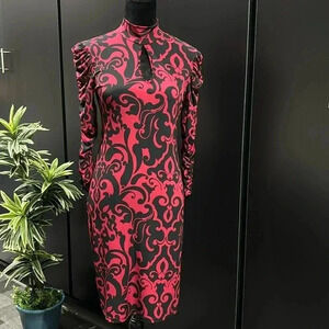 INC Midi Fitted dress,keyhole high neck,long ruched sleeves,soft stretch,pattern