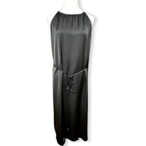 INC Midi Slip Dress Satin Crepe Halter Neck Waist Tie Side Slits Black W 14 NWT