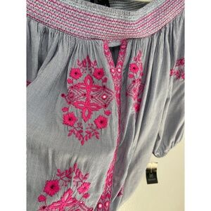 Off- shoulder top with elastic top ( very comfy, doesn’t slide off). Hot pink embroidery with mirror detailing. Very soft thin blue& white fabric.
