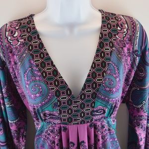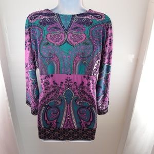 International Concepts INC Teal Blue, Purple and Black Paisley Printed Pleated Shirt. Long sleeves with v-neck. Polyester & Spandex. Size M.