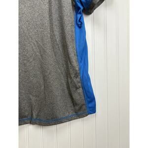 This is a men's short sleeve polo shirt from INC Performance in a regular fit and size L. It features a collared neckline with a zip closure, made of polyester material in a gray color with blue accents. The shirt is designed for a comfortable and stylish casual look, suitable for everyday wear.