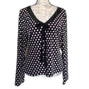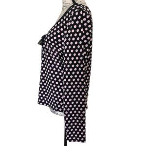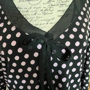 Adorable long sleeve v neck top with sheer trim around the neckline and bow. Polka dots are pink over white on a black background. Fabric has some stretch.This top is in excellent used condition - no signs of wear!