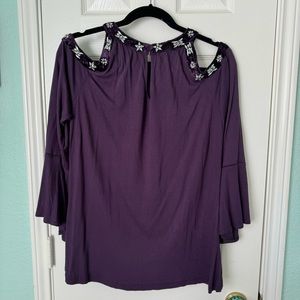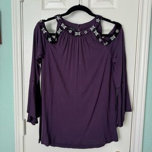 INC Purple Cold Shoulder Velvet Rhinestone Embellished Bell Long Sleeve Blouse Small