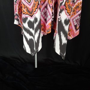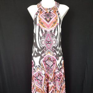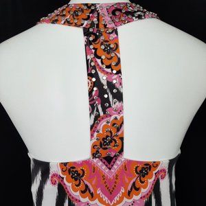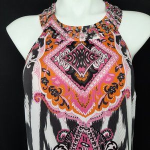 Silver studs enhance the neckline on this stylish handkerchief mid length sundress.