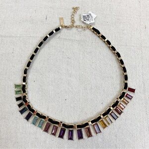 Gold tone box chain with black ribbon woven through, rainbow colored emerald cut rhinestones in a row- nwt