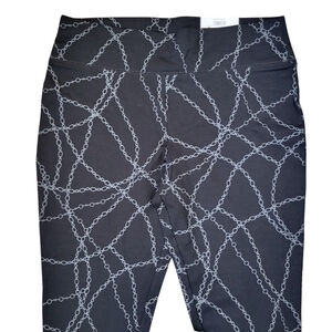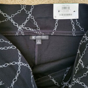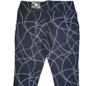 These are new with tags INC International Concepts skinny leg pants in size 16. They feature a mid-rise waist of 36 inches and an inseam of 31 inches. The pants are black in color with a geometric pattern and a pull-on closure. Made of nylon, spandex, and rayon, they have a slim fit and stretch for comfort. The ankle style pants have a logo accent and are suitable for casual, formal, or business occasions.