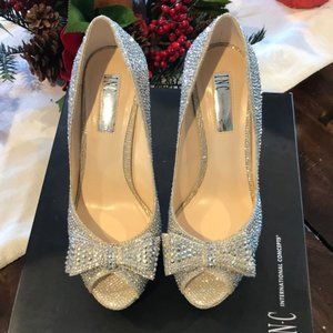 THESE SHOES ARE GORGEOUS!!! Inc International Concepts Vernaa Rhinestone Bow Platform Champagne, Heel Height 5.3", has the original box, worn once.