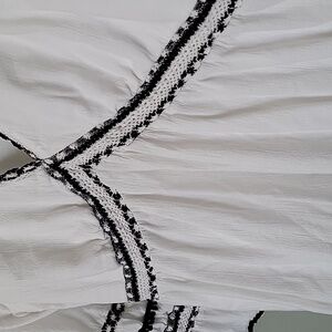 Bell flare sleeves. 3/4 length. White with white embroidered trim around the chest, sleeves, bottom hem. Body is lined, sleeves are not. Black constract piping trim. Gauze like crinkle fabric. Great condition. Doesn't stretch. Brunch, event, spring, summer, school, teacher, festival, park, date night, going out, shower, 70's, feminine, girly, dinner, euro summer, clean girl, soft girl, sweet, twee, travel