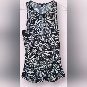 I.N.C. International Concepts Ruched Tropical Printed Sleeveless Jersey Keyhole Tank, Black and White. Polyester Spandex Blend. Size Small.
