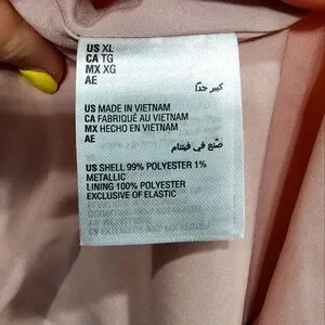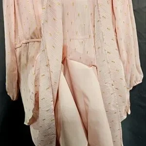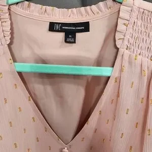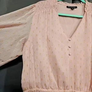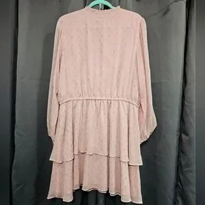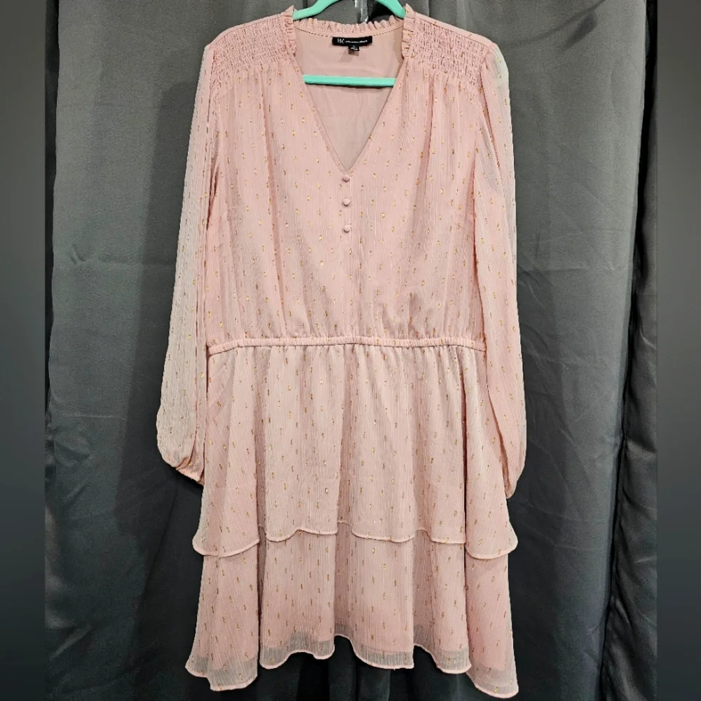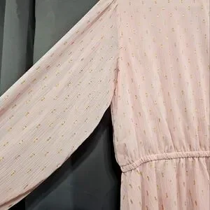 This INC ruffle dress is light pink with gold flecks. Sleeves are sheer and have elastic at the wrist. The bottom of the dress hits above the knees.