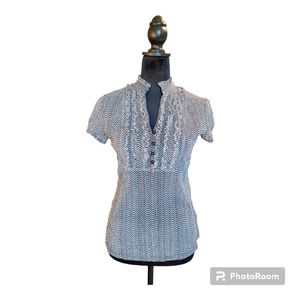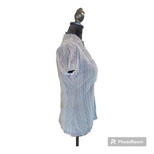 This ruffle front blouse from INC (International Concepts) features a four black button front, as well as a mini mandarin style ruffled neck detail. It is lightweight and provides ample stretch. Pair with black pants, a blazer, and some flats for a business look or for a nighttime look wear it with a mini and some heels.