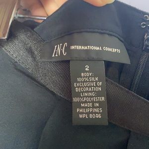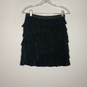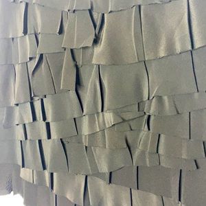 This INC ruffle skirt has asymmetrical ruffles all over. The outside layer is silk and the lining is polyester. The skirt has only been worn a few times but still is in great condition.