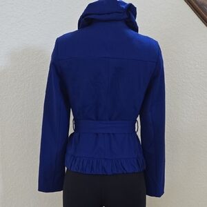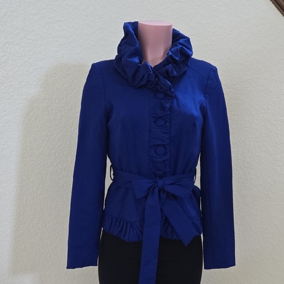 INC Jacket in excellent condition. Fitted and adorned with a ruffled neckline and hem with covered buttons. Size Small
