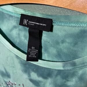 This gorgeous INC International Concepts tie-dye long sleeve top features a stunning sage green and charcoal color blend that creates an organic, artistic look. The centerpiece is an intricate metallic mandala design with paisley and floral motifs that catches the light beautifully. Made from a comfortable cotton spandex blend for stretch and movement, this relaxed fit top is perfect for casual days or elevated weekend looks. The tie-dye pattern gives it that coveted vintage boho vibe while the metallic detailing adds modern sophistication. Size 0X offers generous comfort with a flattering drape. This unique piece pairs effortlessly with jeans, leggings, or layers under jackets. The quality construction and eye-catching design make this a standout addition to any wardrobe. Ready to ship and guaranteed to become your new favorite go-to top.
