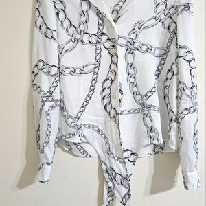 Excellent condition Size XS Approx. 33.5 inches long Notch collar Tie front Satin material Chain link pattern