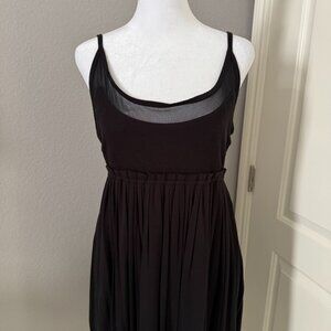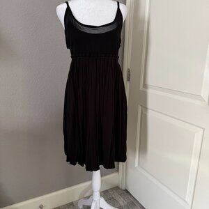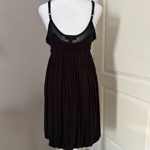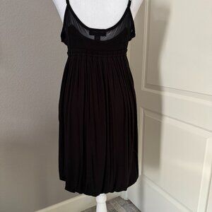 Jet Black short tank dress with a bubble hem. Stretchy material with empire top and is lined. Straps are adjustable. Top has a small amount of fixed see-through trim. This is a pull on style and hits at knee length on me (5'7"). It has a looser fit and material is soft to the touch Never worn.