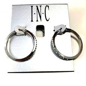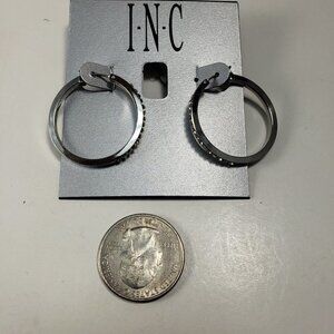 These INC silver-tone sparkling crystal hoop earrings add a touch of glamour to any outfit. The hoops are encrusted with shimmering crystals, providing a dazzling shine. Perfect for both casual wear and special occasions, these earrings are versatile and elegant, making them a must-have in any woman's fashion jewelry collection. New With tag.