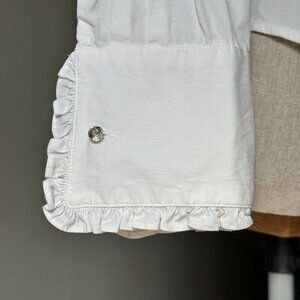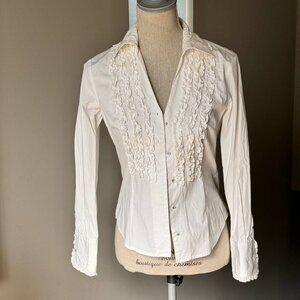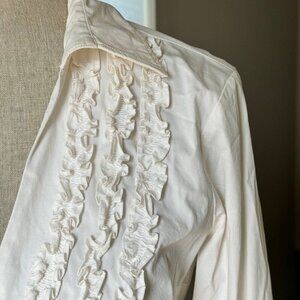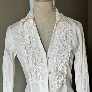 Features v-neck collar, ruffles in front, ruffles trimmed cuffs, crystal buttons. Perfect shirt to elevate any look. Wear with your fave jeans, dress pants or metallic skirt.