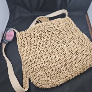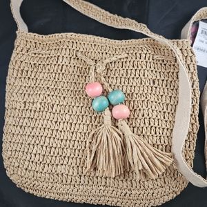 Pull cinch with beaded tassel. Inside has magnetic closure, side zipper compartment with two inside pockets. Full length strap is 46" drop is 23". New with tags.