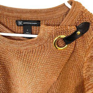 INC International Concepts surplice design at the front and a chic faux-leather buckle at the shoulder. It opens up allowing you to wear as a cardigan