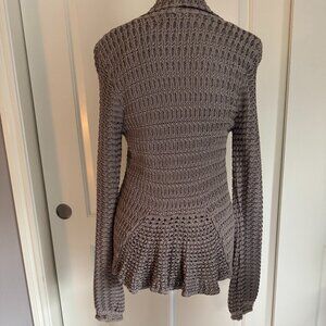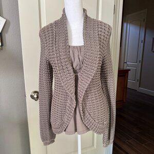 INC Taupe Knit Open Style Cardigan, Size Medium. Made of Cotton and Rayon and is really beautiful. It has one hook and eye for closure and a ruffle in the back. Long sleeves with soft fit at wrists. I'm including the matching taupe tank that I bought separately to wear under it. It has adjustable straps. The tank is a size large as INC tanks run on the smaller side. If you don't want the tank I don't need to include it.