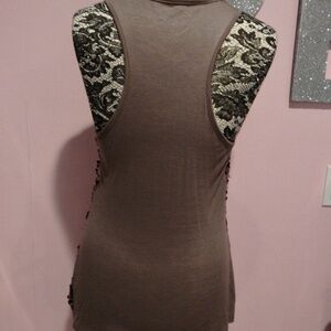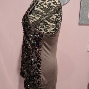 A wonderful razor tank that can be dressed up or down. Comfortable jersey t-shirt feeling fabric that has fun sequence embellishment in the front.