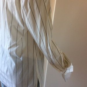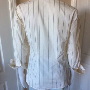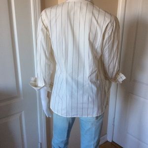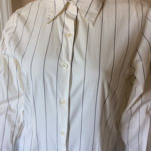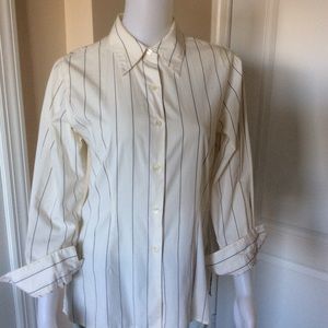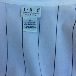 INC long sleeve top features classic button down styling, point collar and vertical stripe print B/W. Length 24”. Pit to pit 17”. Size Petite. Gently used.