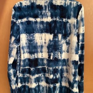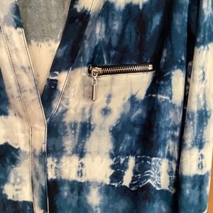 INC tie dye top in excellent condition (like new). Light-weight V neck polyester top with silver zipper detail on pockets. Fabric content 95% polyester and 5% spandex. Sleeve length 21 inches, width 15 inches, length 21.5 inches.