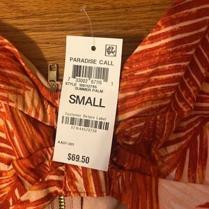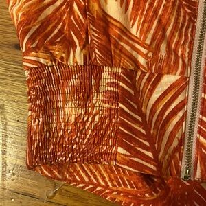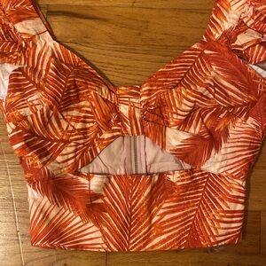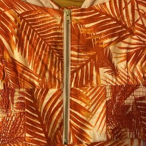 NWT INC Tropical Crop Top. Summer Palm. Sweetheart neck with cut out under bust. Flutter sleeves, zip up back, smocked sides. Size Small. Burnt orange red color.