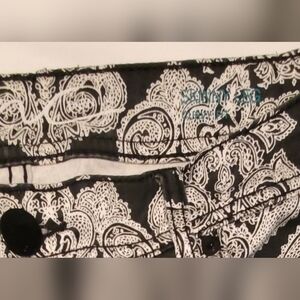 INC International Concepts Paisley print black and white skinny leg curvy fit ankle jeans.